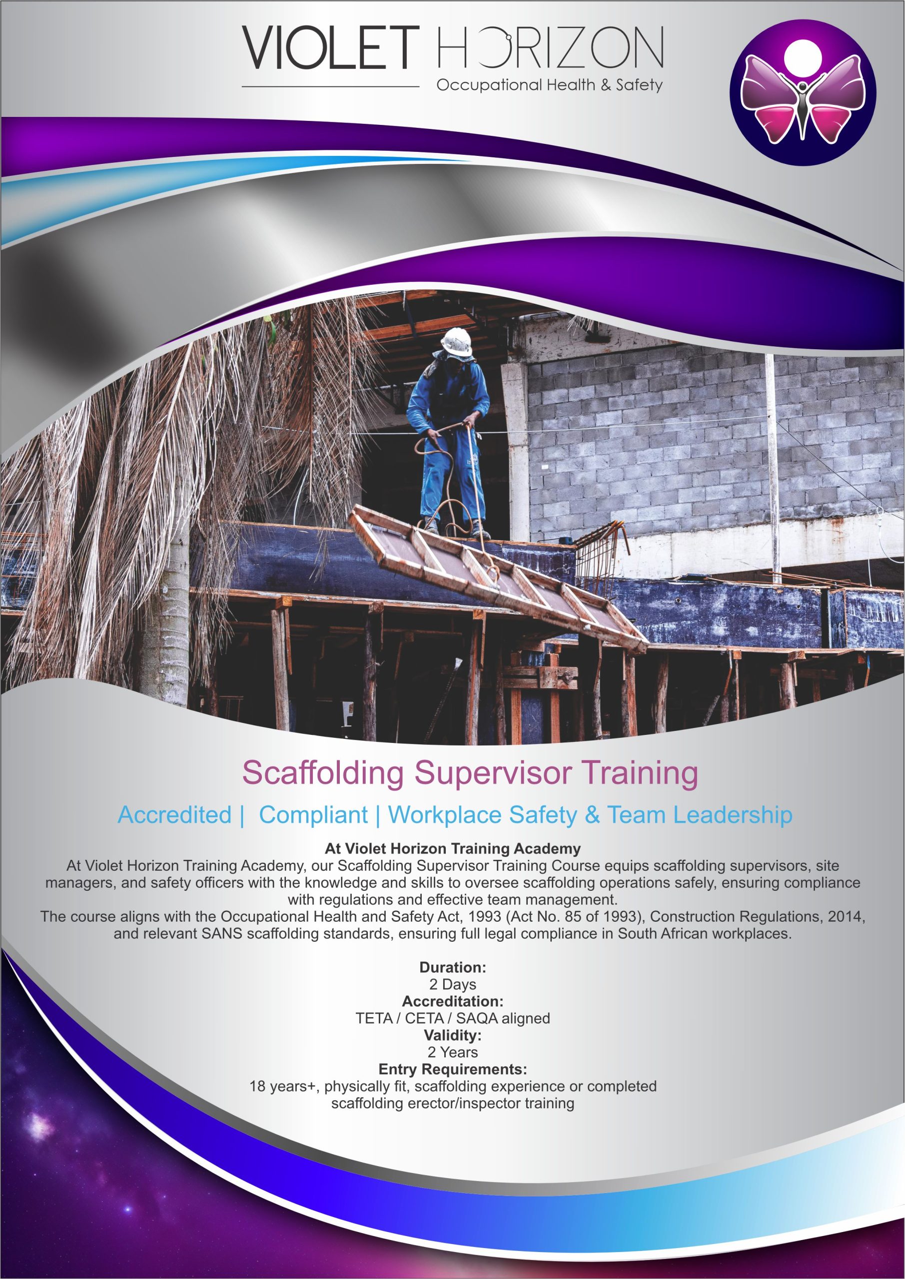Upon successful completion, learners receive a Violet Horizon Accredited Scaffolding Supervisor Certificate, valid for 2 years, demonstrating compliance with OHS Act, Construction Regulations, SANS scaffolding standards, and SETA requirements.